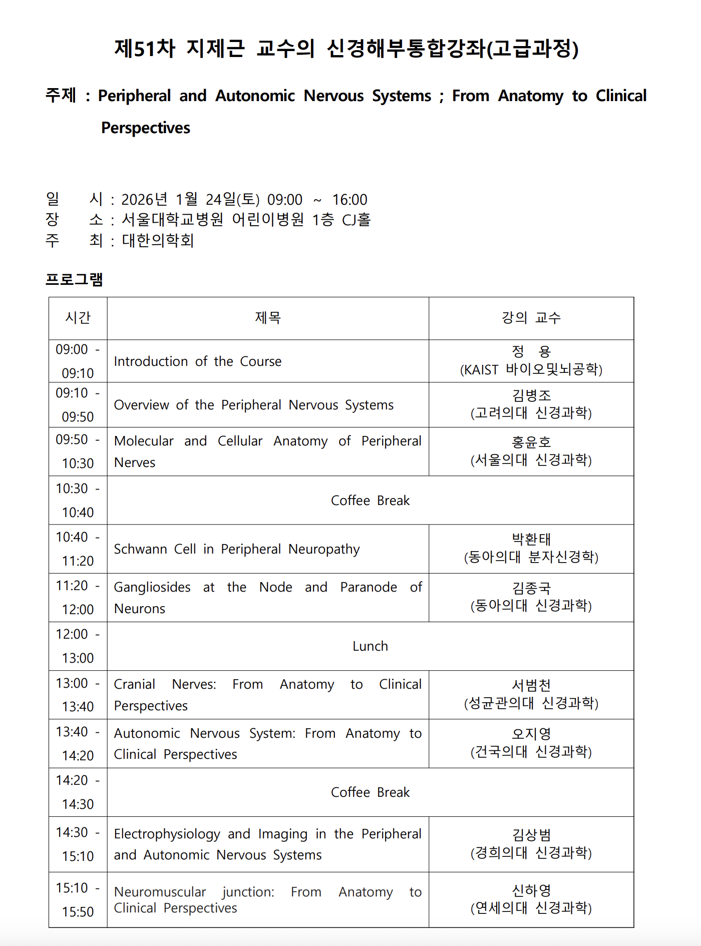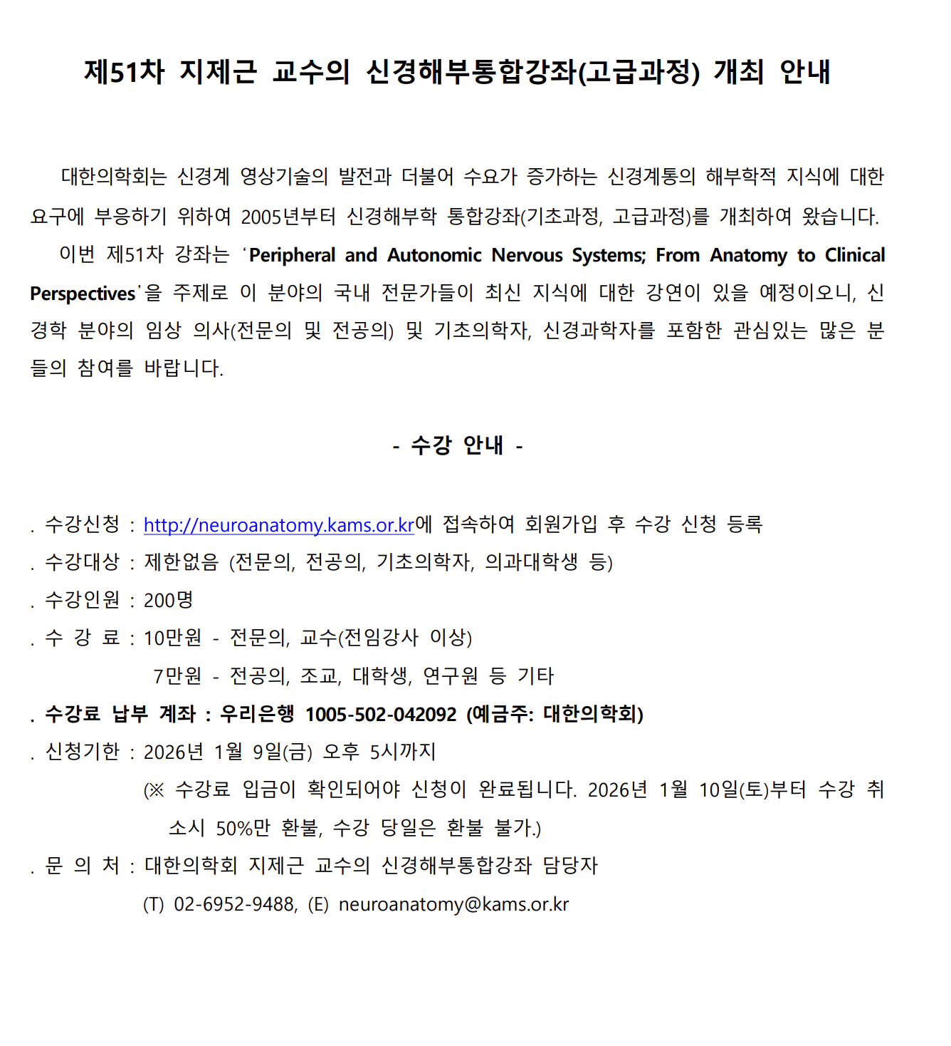 [기타] 제51차 지제근 교수의 신경해부통합강좌(고급과정) 안내 조회수 : 8 게시일 : 2025-11-05 http://neuroanatomy.kams.or.kr 목록 이전글 KMDS 2025 연구자상 수상자 안내
