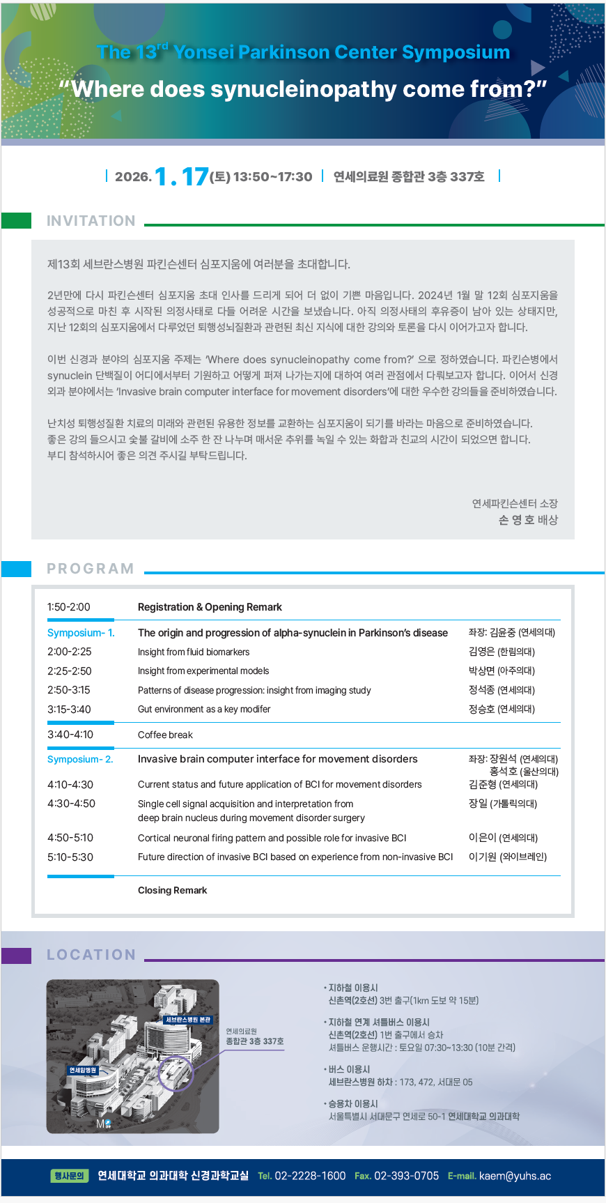 [기타] 제13회 세브란스병원 파킨슨센터 심포지움 안내 조회수 : 192 게시일 : 2025-12-09 제13회 세브란스병원 파킨슨센터 심포지움 25 01 17.pdf (다운로드 : 56회) 목록 다음글 제5회 헌팅턴병 심포지엄 안내 이전글 2026년 제19회 가톨릭대학교 의과대학 내과 연수강좌 안내