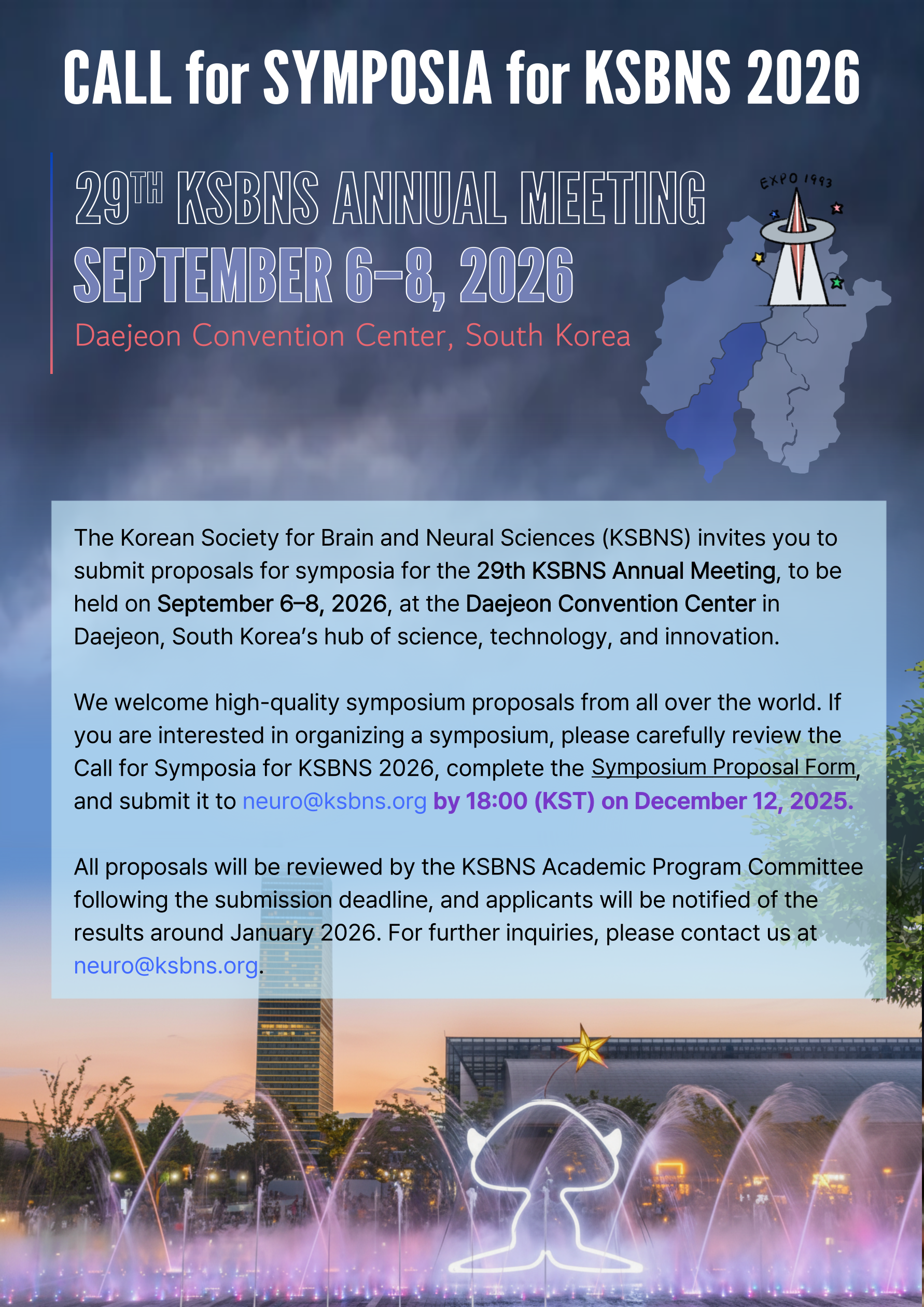 [기타] 2026 한국뇌신경과학회 정기국제학술대회 심포지엄 주제 공모 조회수 : 17 게시일 : 2025-11-17 붙임1 KSBNS 2026 심포지엄 공모 안내문.pdf (다운로드 : 5회) 붙임2 KSBNS 2026 심포지엄 신청서 양식.docx (다운로드 : 5회) 목록 이전글 제51차 지제근 교수의 신경해부통합강좌(고급과정) 안내