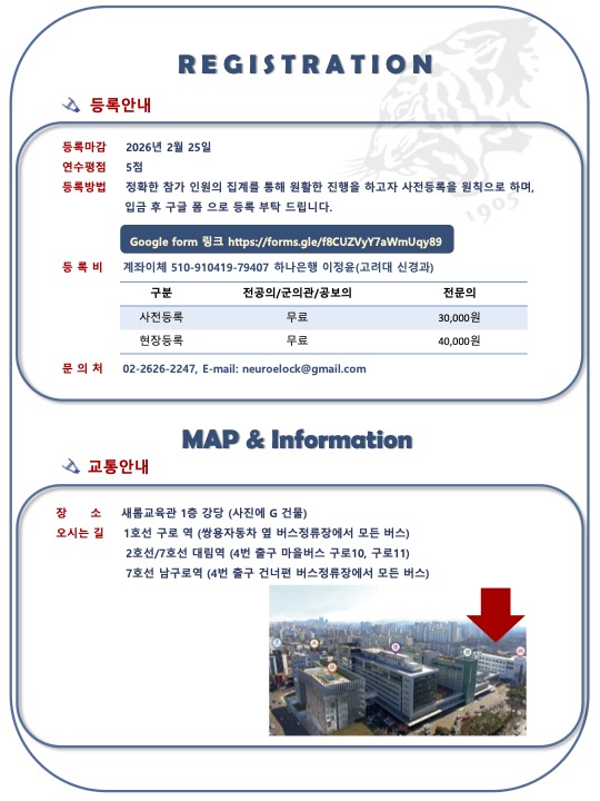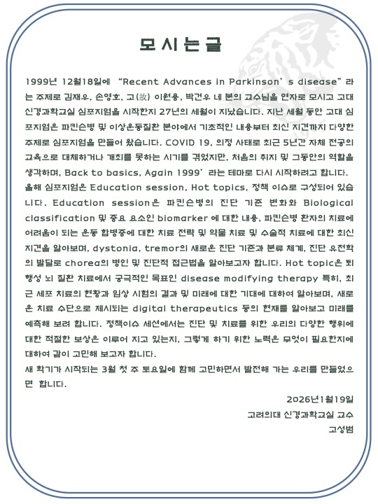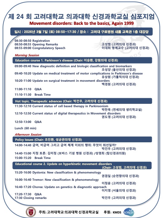 [기타] 제24회 고려대학교 의과대학 신경과학교실 심포지엄 조회수 : 27 게시일 : 2026-01-23 목록 다음글 2026 이명식 교수상 및 KMDS 학술상 공모 안내 이전글 진동용뇌전기자극장치(IPG) 카드뉴스 배포 및 홍보 협조요청